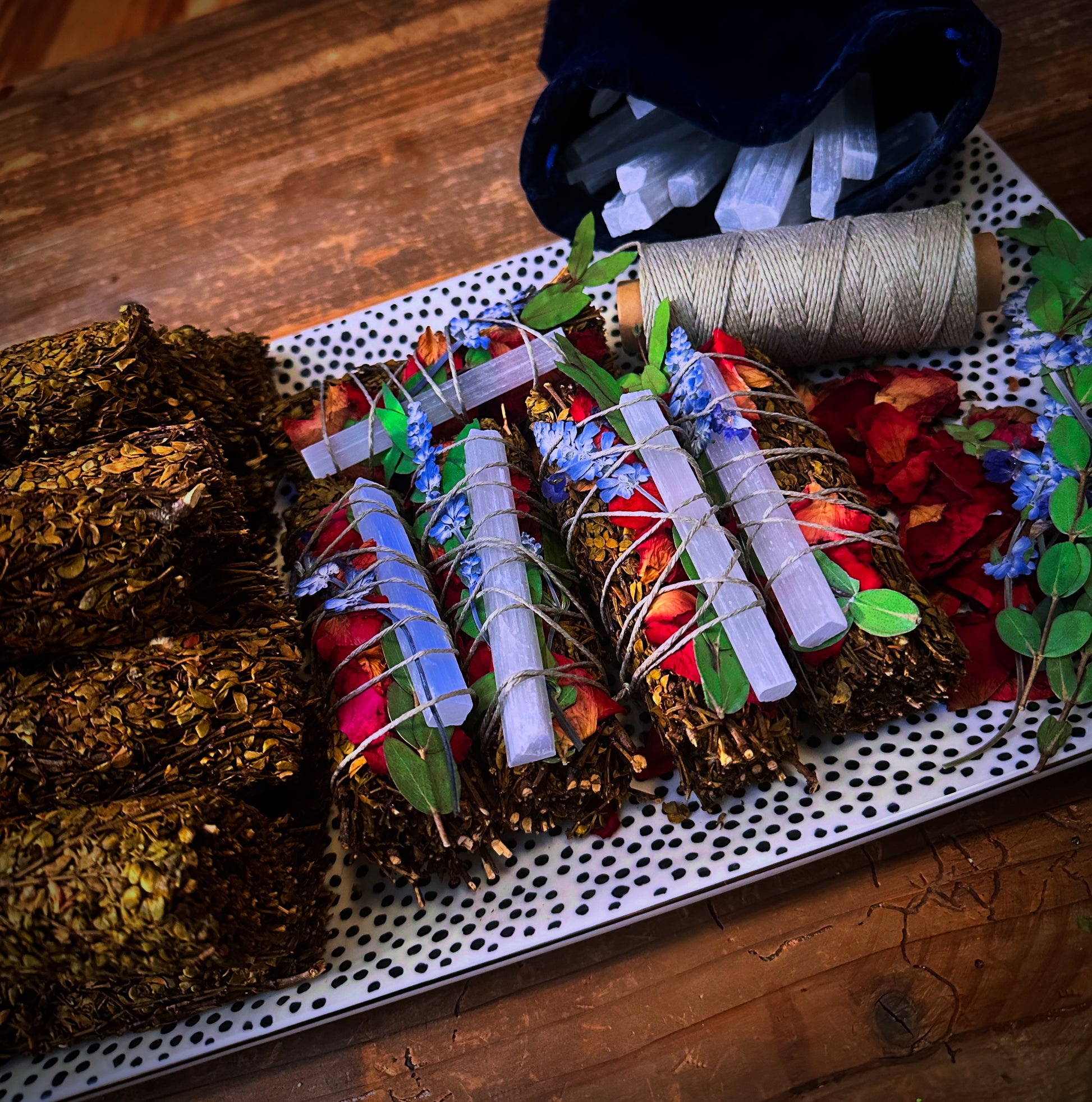 These hand-rolled Creosote Bundles are made with dried chaparral, rose petals, eucalyptus, and lavender bundled with selenite sticks—ushering in the scent of desert rain! Perfect for cleansing, protecting, and making sacred space.