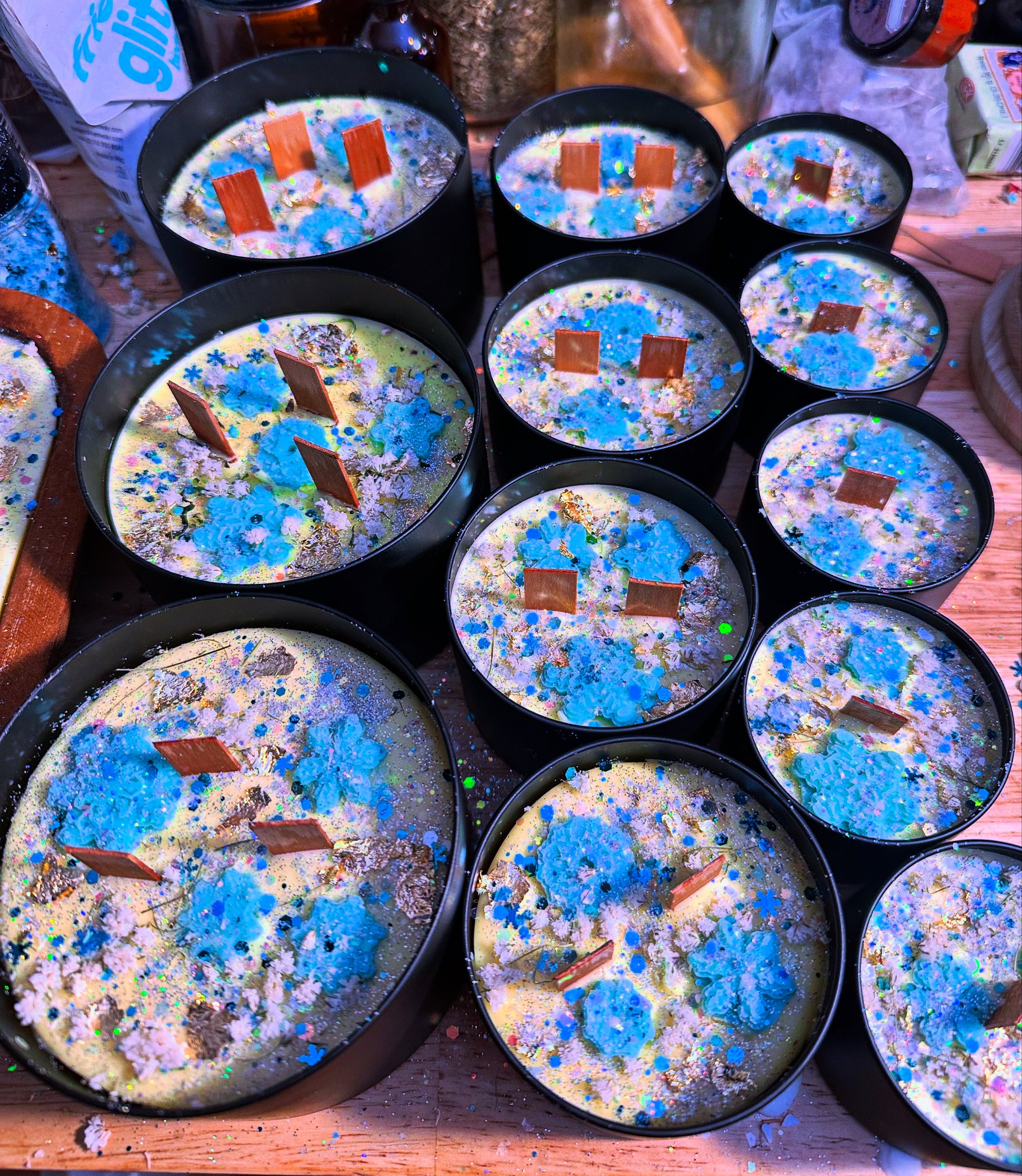 Our Frosted Cranberry candles are infused with wintergreen, sweet orange, grapefruit, and cherry essential oils and adorned with assorted botanicals, wax snowflakes, and glitter, sure to usher in joy into any home!