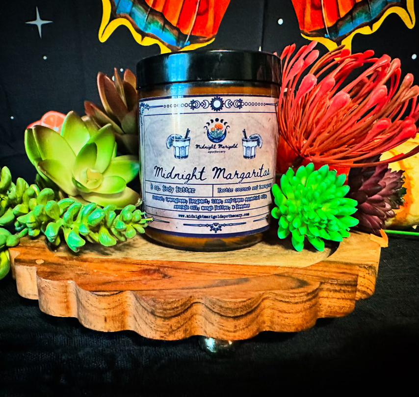 Midnight Margaritas Body Butter is a rich, indulgent, and truly luxurious tropical treat for your skin. Made with coconut, lemongrass, bergamot, lime, and lemon essential oils, avocado oil, mango butter, and beeswax, this body butter will wrap your skin in velvety moisture and deep nourishment.