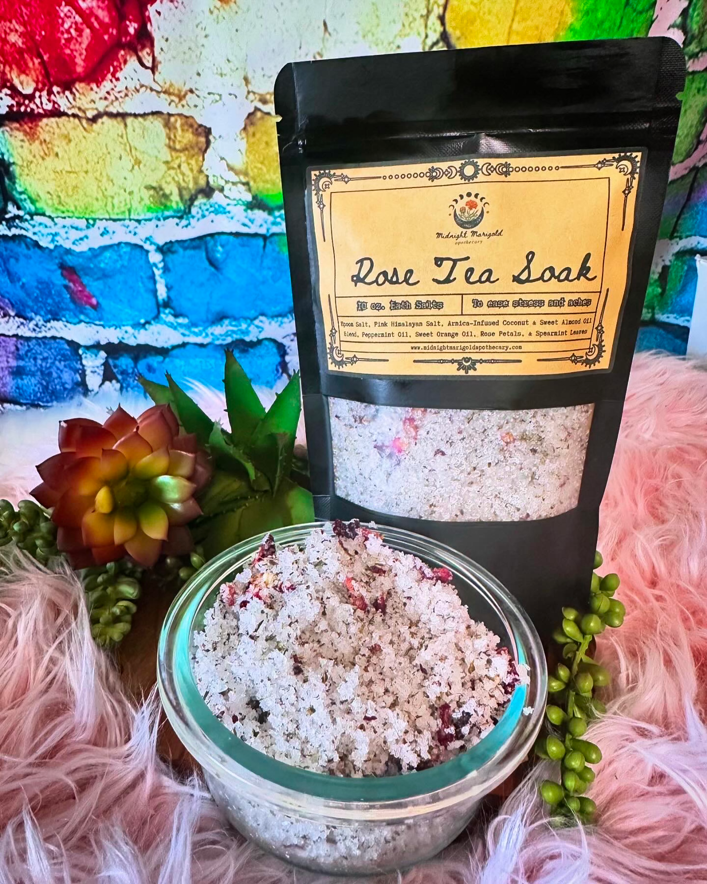 This Rose Tea Soak is your bath's soulmate, perfect to ease stress and tension and to relax muscles and soothe aches. These bath salts are made with epsom salt, Himalayan pink salt, an arnica-infused coconut/sweet almond oil blend, peppermint oil, sweet orange oil, rose buds and petals, and spearmint tea leaves. Prepare for your senses to be invigorated and lifted, and your body soothed!